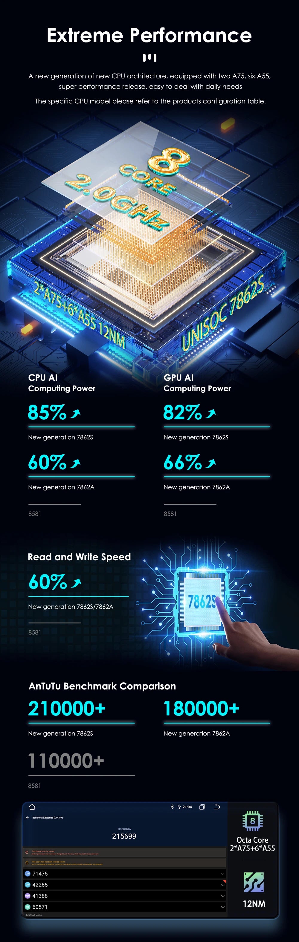 Interface do usuário: Série S (pode definir como o tipo de cor 4: Roxo/azul escuro/preto/dourado) incluiu a versão S8/ S7/ S6/ S5/ S4/ S3/ S2/ S1; e A Series incluiu a versão AC1 / AC2.Desempenho extremo: Uma nova geração de nova arquitetura de CPU, equipada com dois A75, seis A55, versão super desempenho, fácil de lidar com as necessidades diárias. O modelo específico do CPU consulte a tabela de configuração do produto.