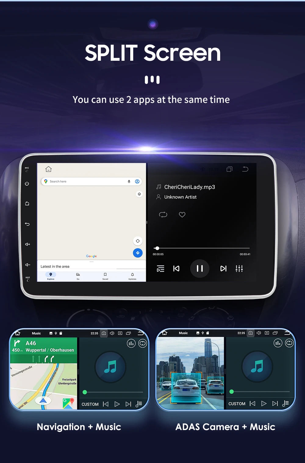 Suporta AV-OUT: AV OUT box (Precisa de encomendar separadamente)Split Screen: Você pode usar 2 aplicativos ao mesmo tempo (como: Navegação + Música, Câmera ADAS + Música, etc.)