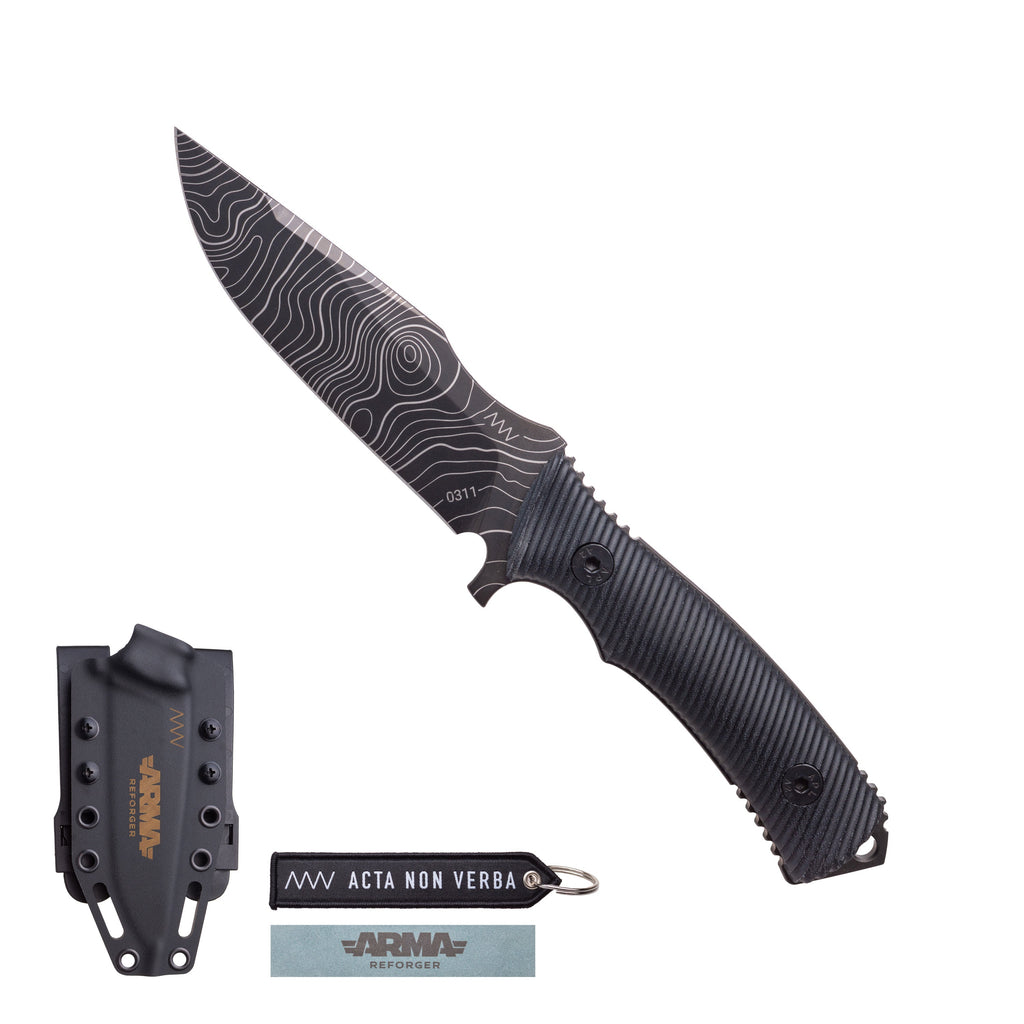 Crafted from Swedish Sleipner steel, the knife features a laser-engraved topographic map from Arma Reforger on the blade and a durable black micarta handle for a confident grip in any field condition.
