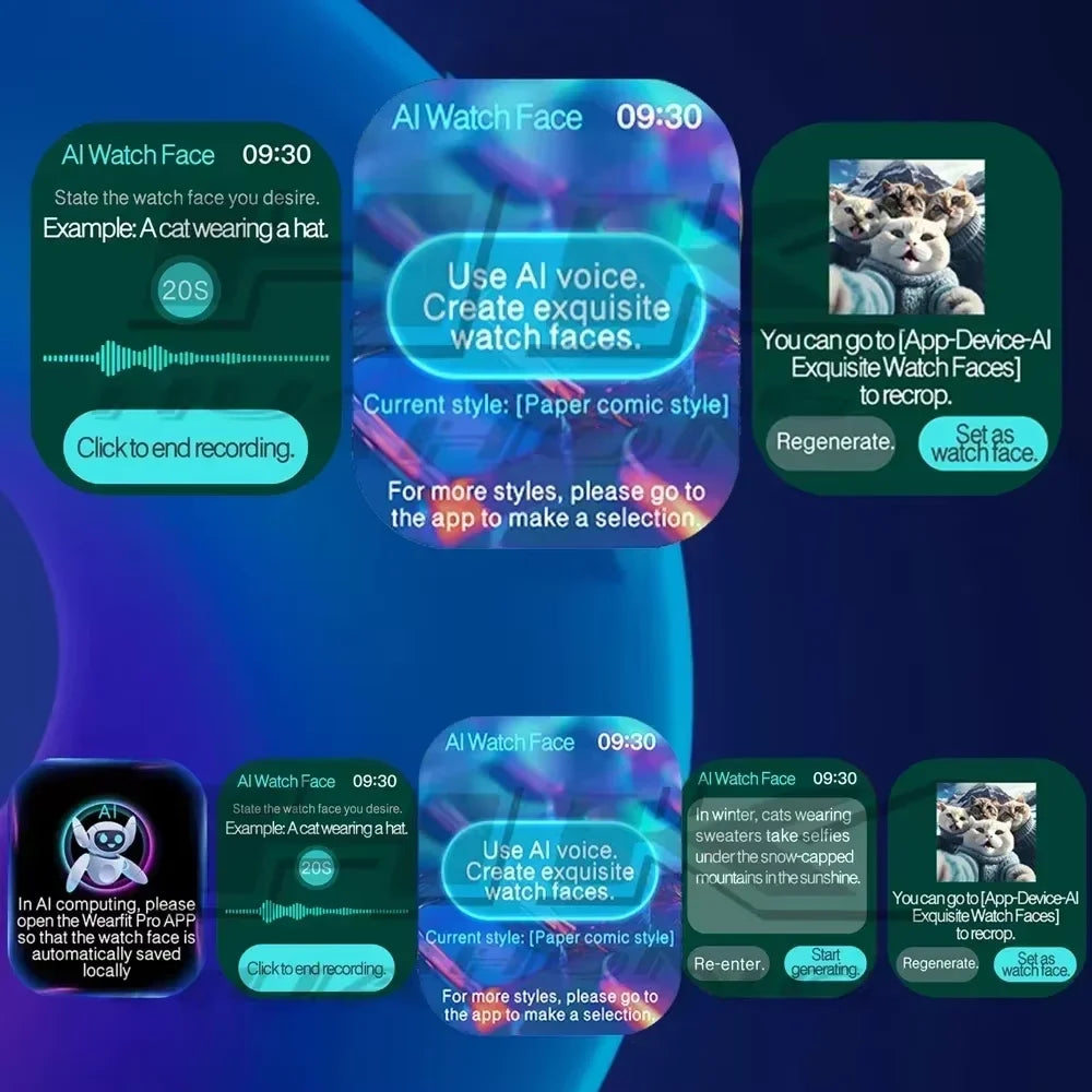 AI watch face, AI translation, AI photo album: AI artificial intelligence generates a dial! Generate any dial you want in one sentence, supporting multiple languages (Simplified Chinese,English, Russian, Japanese, Korean, Vietnamese, German, Thai, French Arabic) AI photo albums, keep the AI watch faces you generated AI translation, convenient, fast and fast voice translation