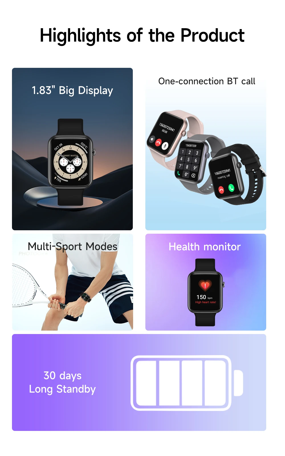 One-connection BT call, Voice assistant, Red light SpO2, Continuous heart rate monitor, 100+ watch face, Multi-Sport Modes |